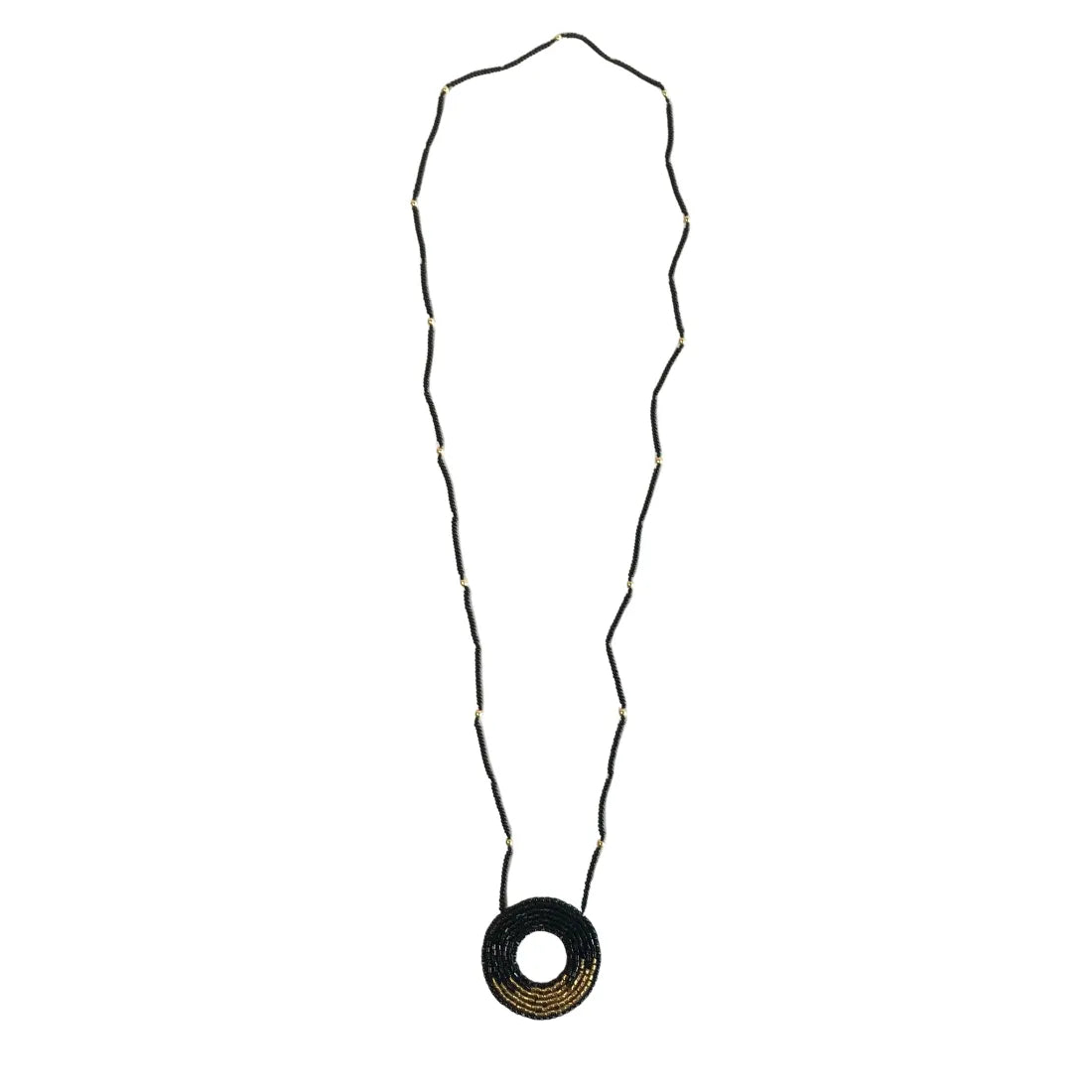 Este collar largo está tejido con finas mostacillas que forman una espiral hipnótica, símbolo de movimiento, tiempo y conexión. El dije central evoca la perfección de lo simple, mientras la cadena de mostacillas con pequeños acentos metálicos le da un brillo sutil y moderno.