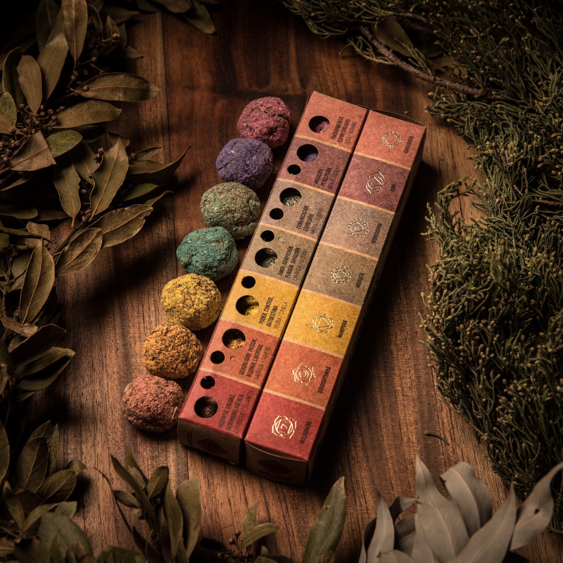 Chakra Corona: Sándalo Chakra Tercer Ojo: Lavanda Chakra Garganta: Copal Chakra Corazón: Romero Chakra Plexo Solar: Palo Santo Chakra Sacro: Mirra Chakra Raíz: Rosas