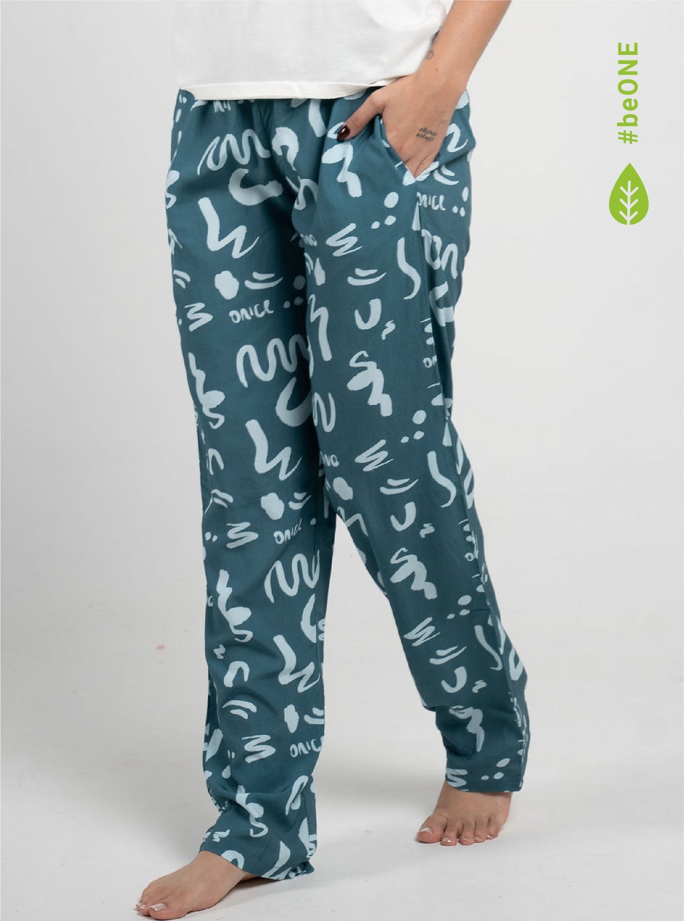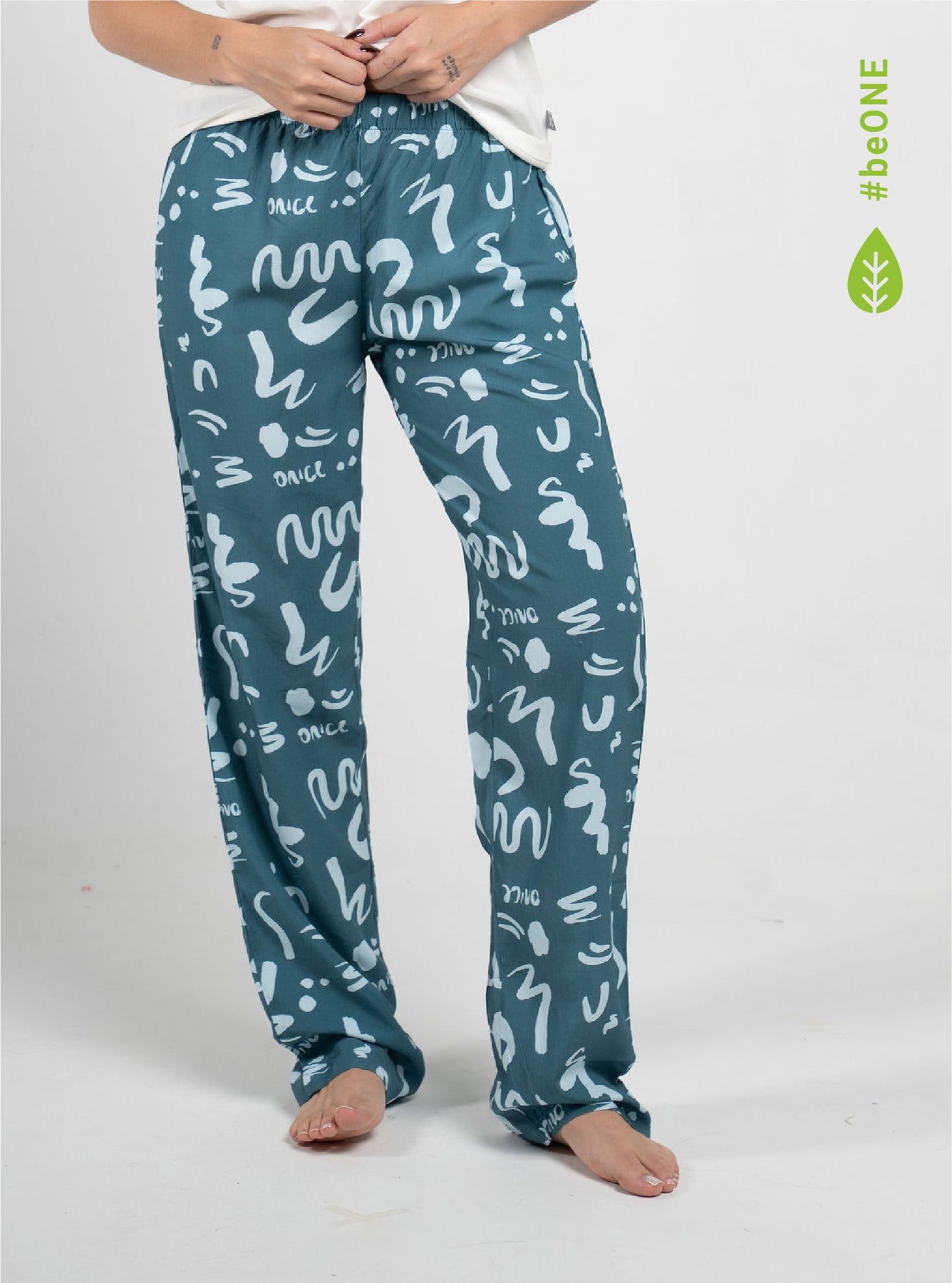 Pantalón Azul de silueta amplia con bolsillos laterales, elástico en cintura, tiro medio, bota recta, pretina enresortada de 3cm de ancho, cómoda y con soporte.
