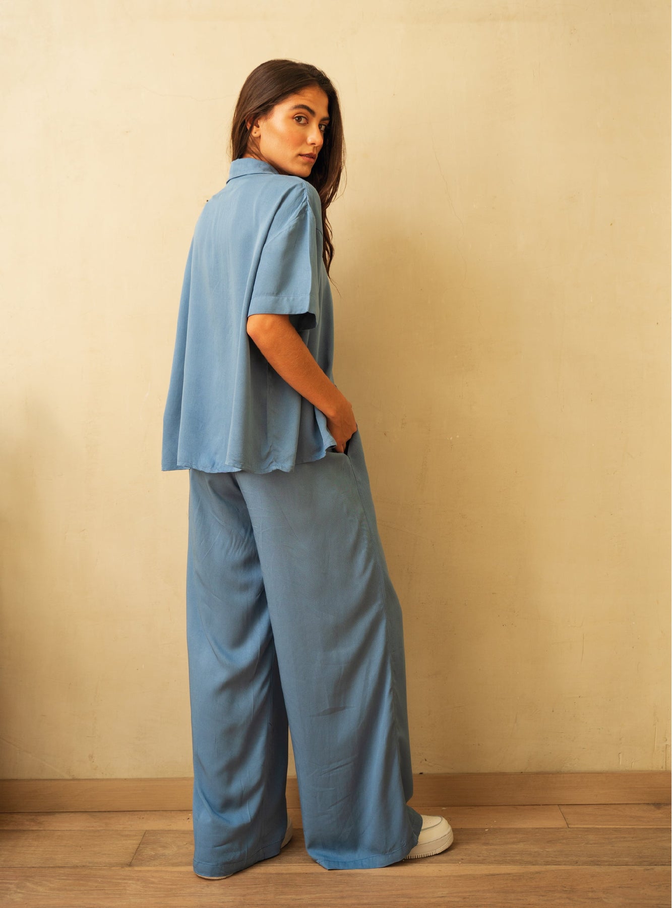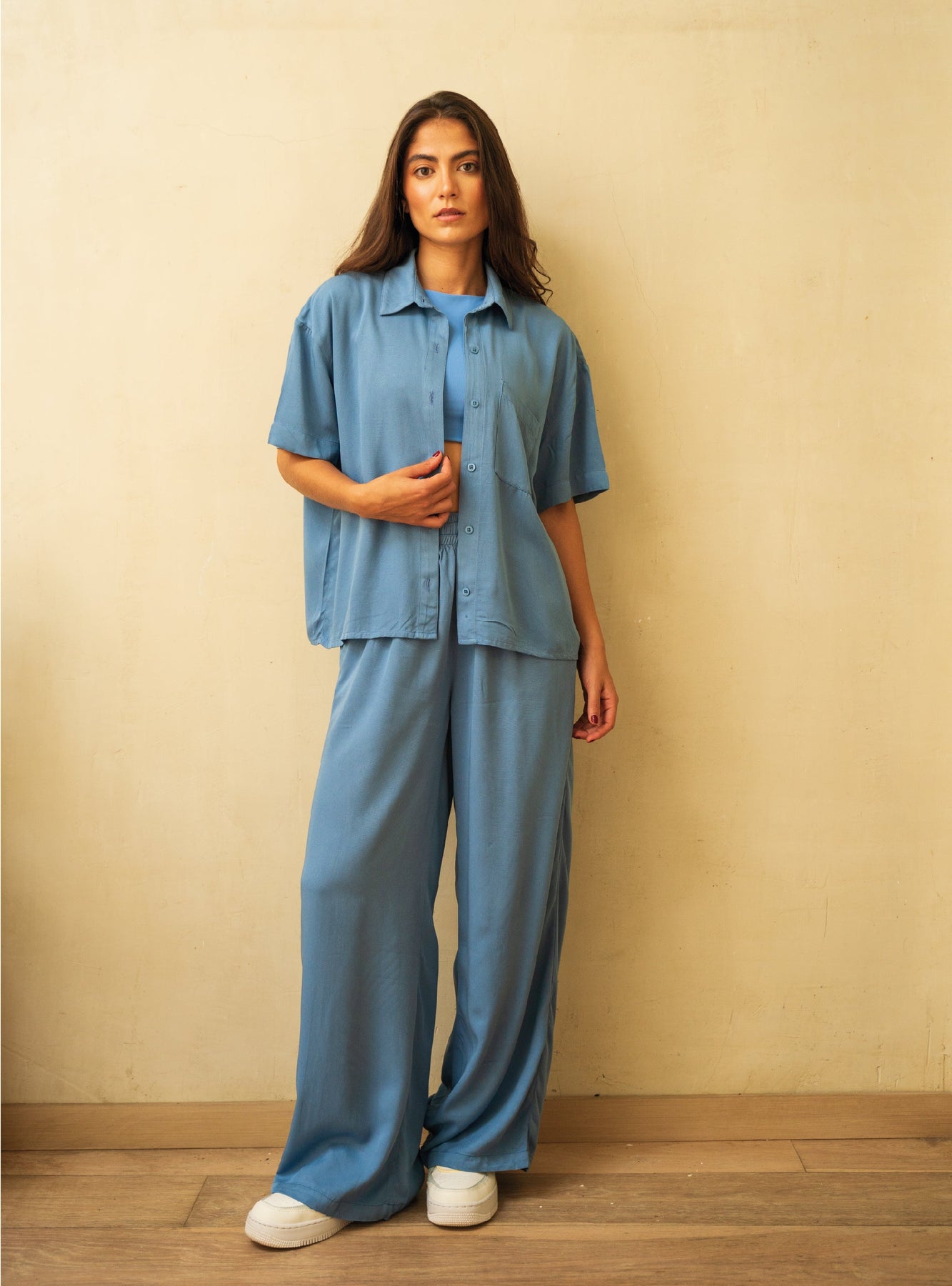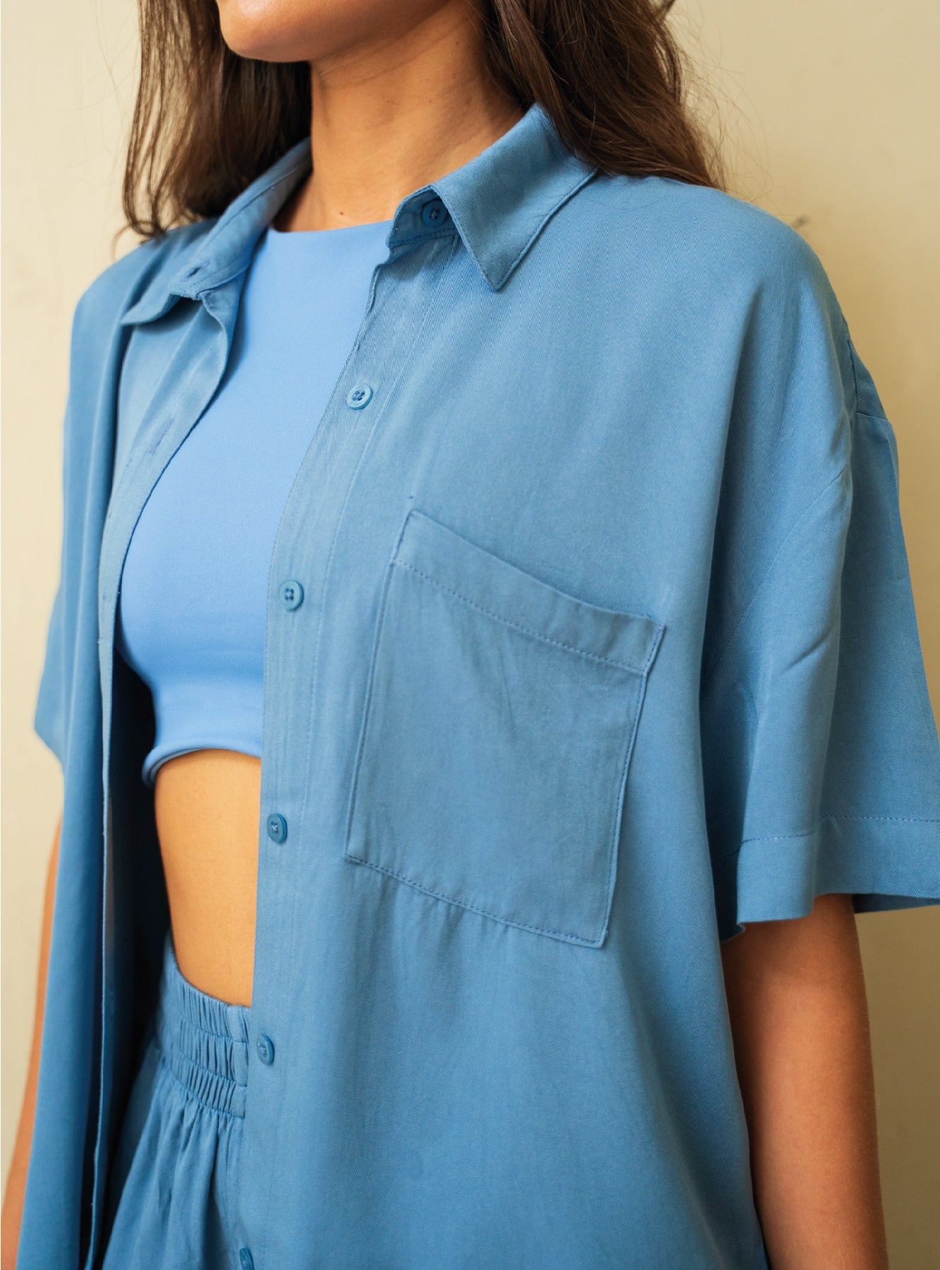 Camisa Azul Zafiro manga corta con cuello, perilla, puños con botones, cierre frontal con botones y bolsillo lado izquierdo prenda puesta.