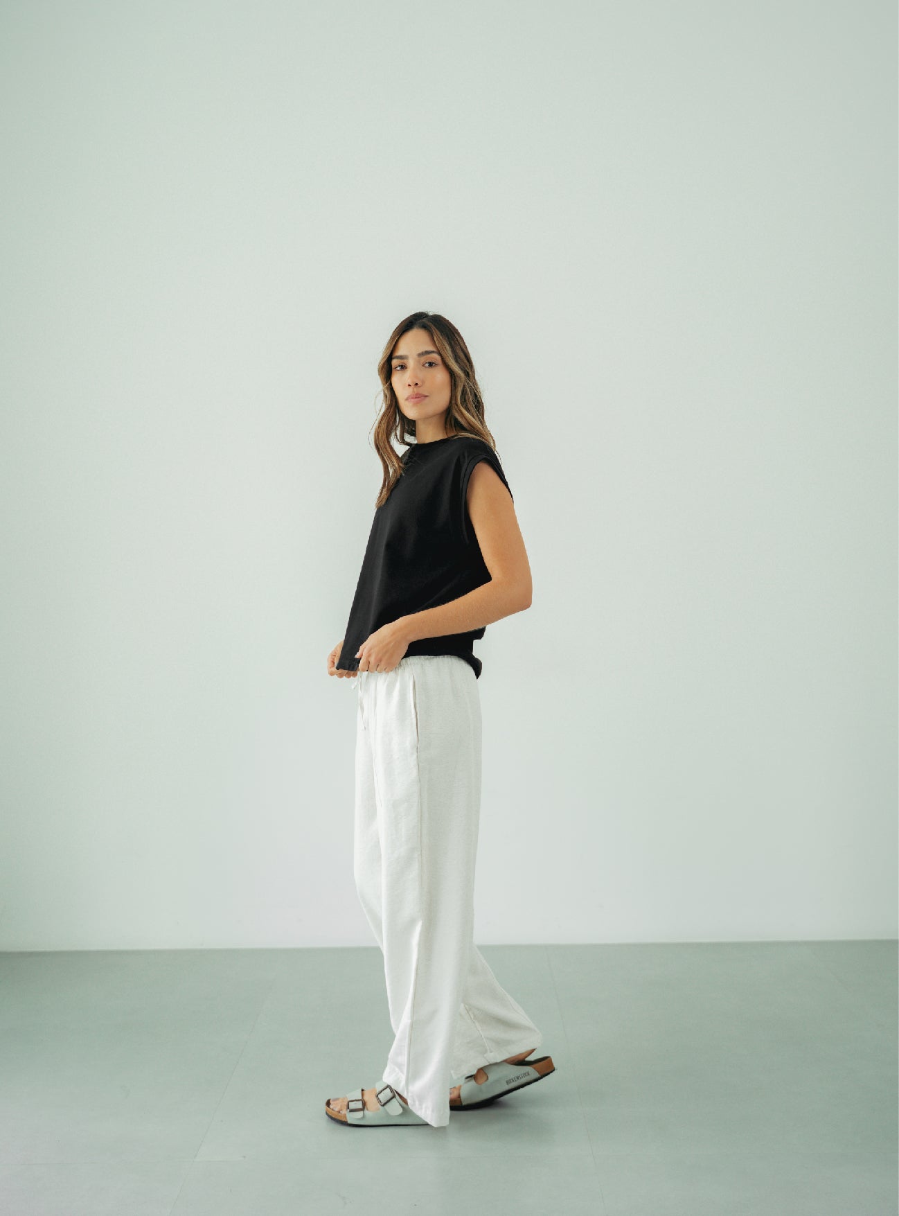 Camiseta Negra 100% algodón de alta calidad,  tacto frío, suave y fresco, cuello redondo en rib, manga corta rodada y silueta amplia. Banderín con logo.