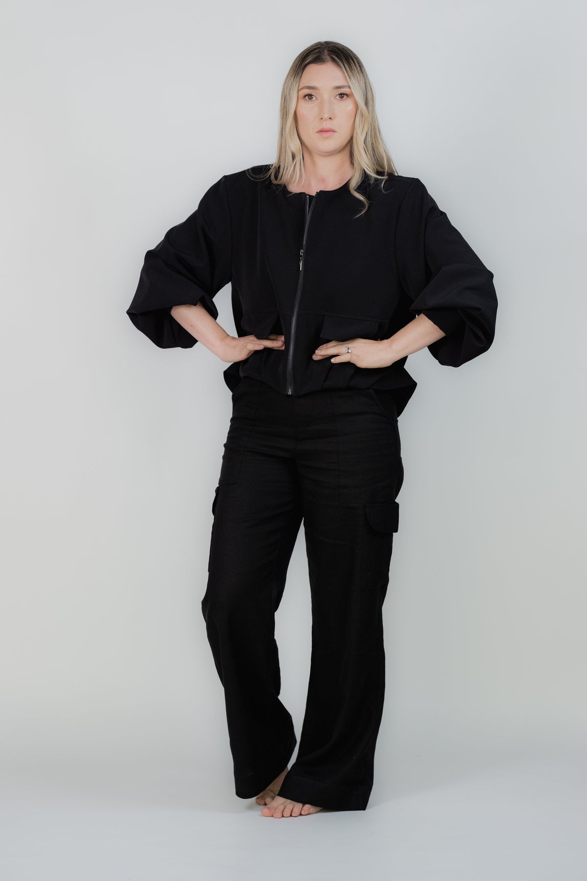 Chaqueta Bomber moderna en Rayon con manga tres cuartos abullonada. Pliegues adelante y atras que le dan volumen y movimiento. Cierre frontal con cremallera. Falsos Bolsillos. Ideal para un look moderno y sofisticado