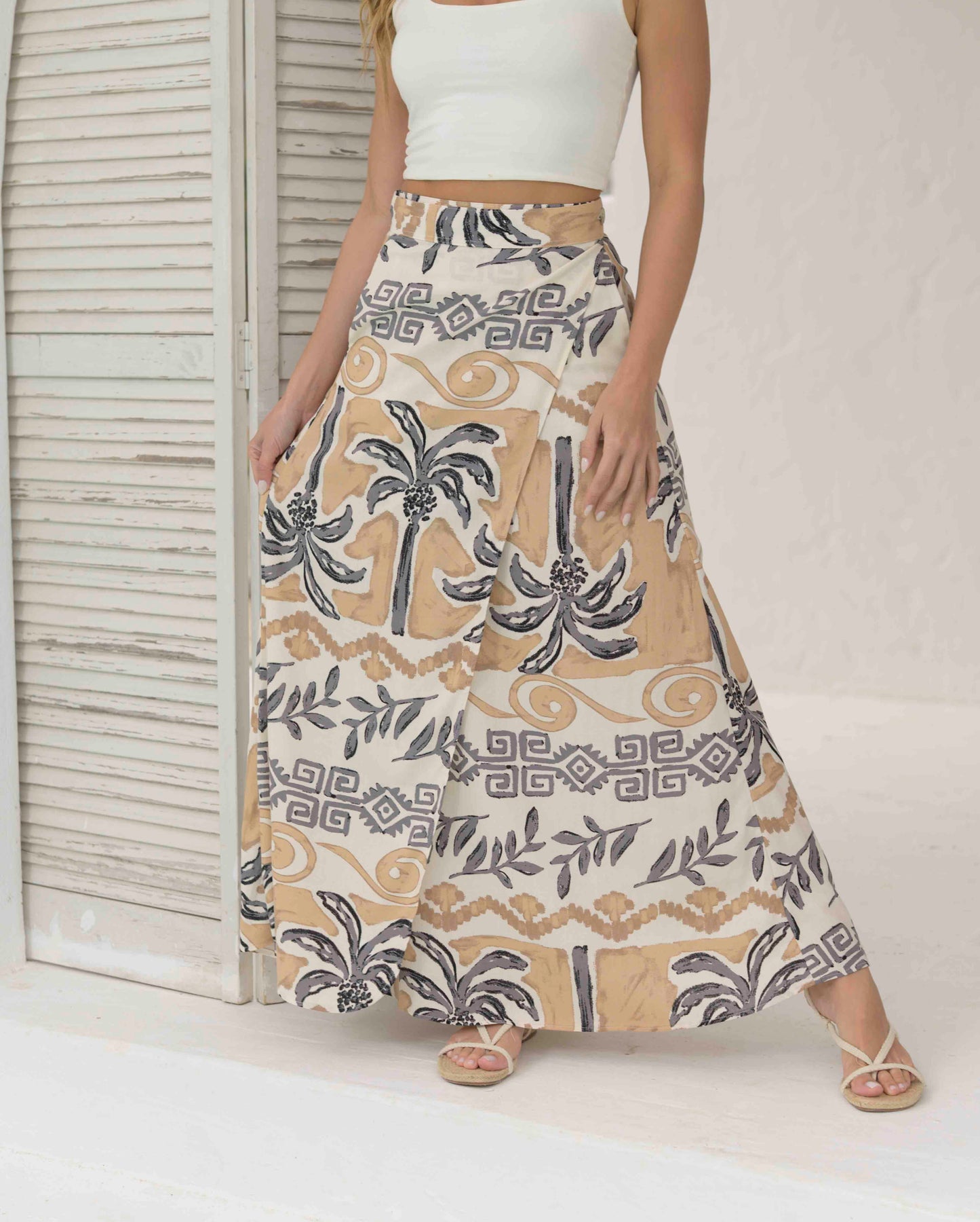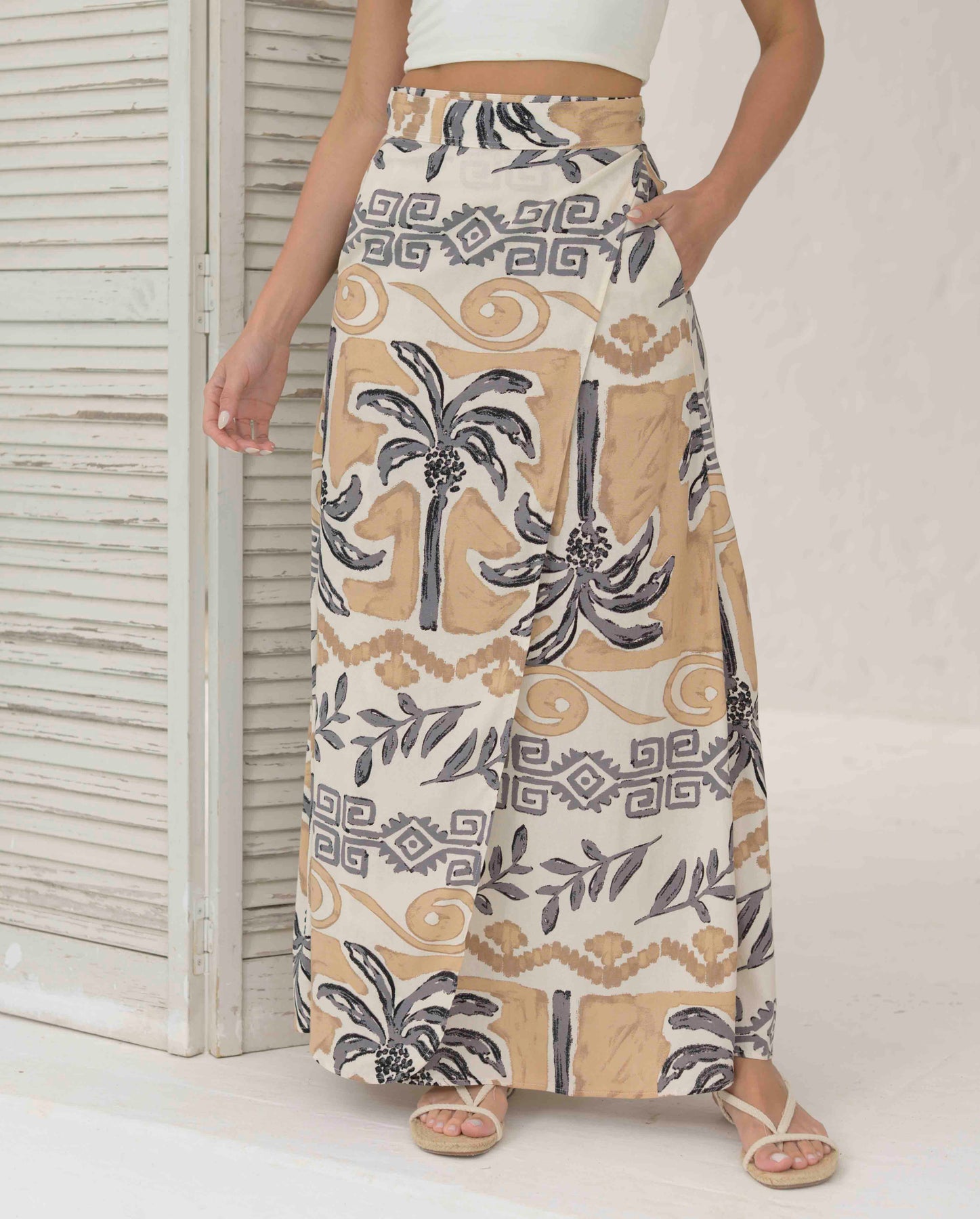 Falda maxi envolvente confeccionada en lino, ideal para crear looks elegantes y versátiles. Su estampado marfil aporta movimiento y sofisticación a cualquier atuendo, mientras que el material respirable garantiza comodidad durante todo el día. Perfecta para ocasiones especiales o para elevar tu estilo casual con un toque de distinción.