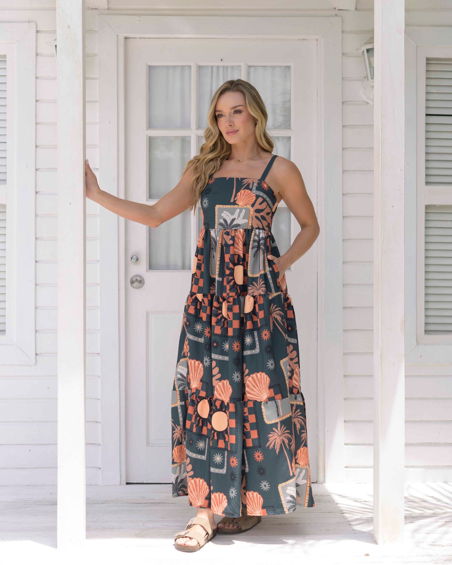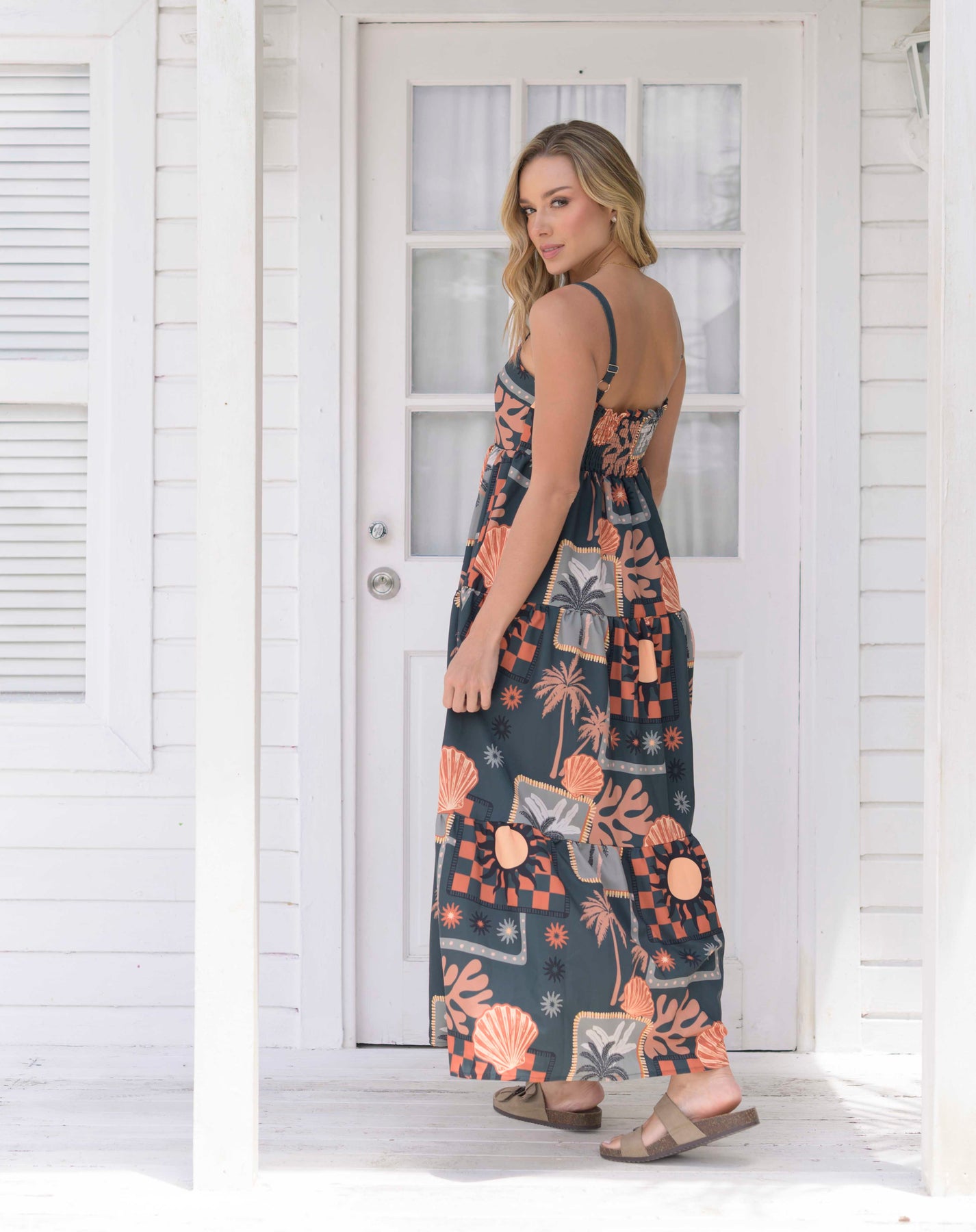 De silueta amplia y fluida, con tiras ajustables y espalda con delicado recogido elástico que se adapta al cuerpo. Su tela ligera y con excelente caída resalta un estampado tropical moderno en tonos terracota, coral y verde oscuro, inspirado en la naturaleza y el verano. Ideal para climas cálidos o para un look relajado y femenino, este vestido combina comodidad, frescura y estilo en una prenda versátil.
