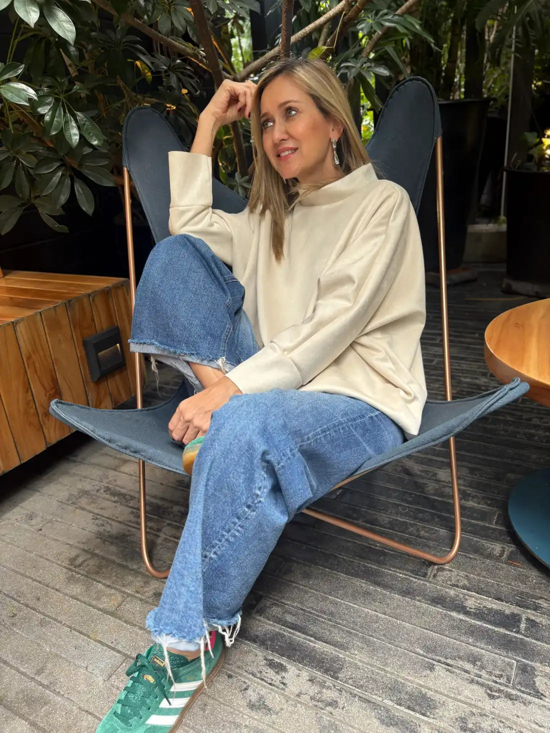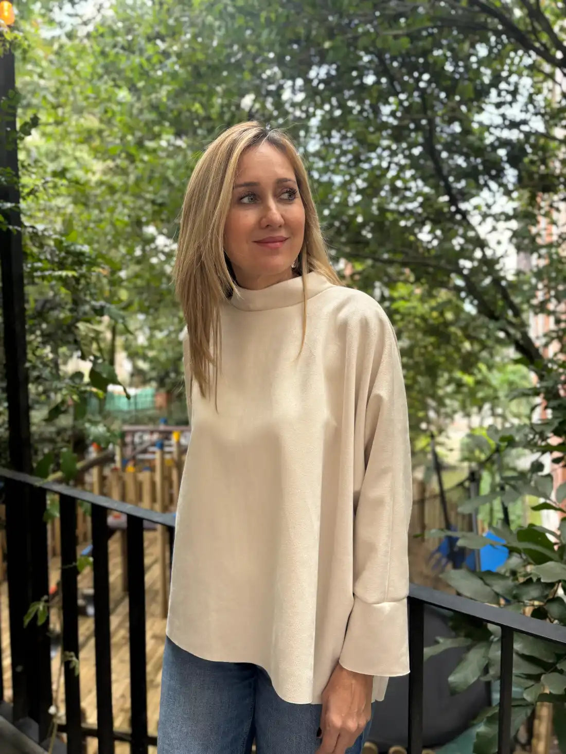 Escencial y sofisticada en su máxima expresion! Este jersey es la pieza perfecta para un look effortless. De silueta amplia y cuello tortuga ... la mezcla perfecta de elegancia y comodidad . Su diseño ligero y el cuello alto aportan un toque chic y contemporaneo. Ideal para looks versatiles con un encanto sutil . Textura suave tipo gamuza en poliester.