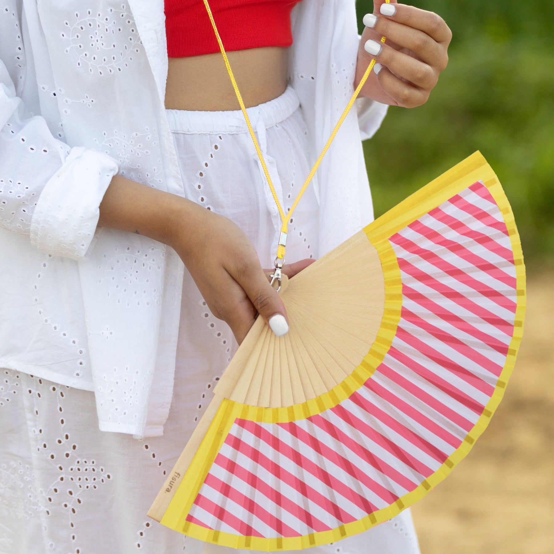 Dale un toque fresco y colorido a tus looks veraniegos con este abanico de rayas rosas que se convertirá en tu accesorio favorito en los días en los que el sol no para de brillar☀️. Además, incluye un práctico colgador para que siempre lo tengas a mano. ¡Cuélgatelo y olvídate de rebuscarlo en el bolso o la mochila 🎒 cuando más lo necesites!