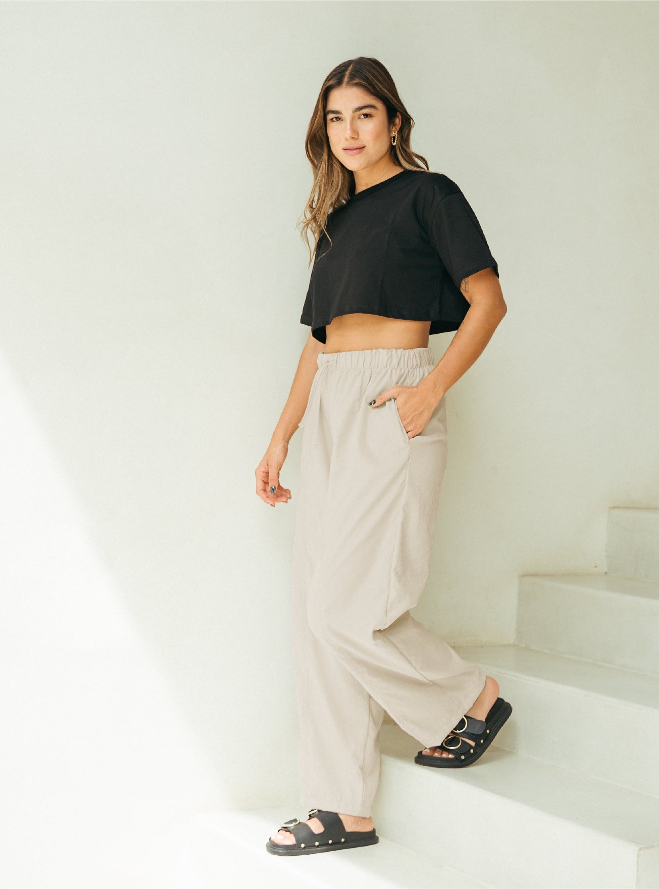 Silueta Barril corte holgado de cadera a muslos. Bolsillos laterales, elástico en cintura, tiro medio y cordón ajustable. Tela ultra ligera y suave.