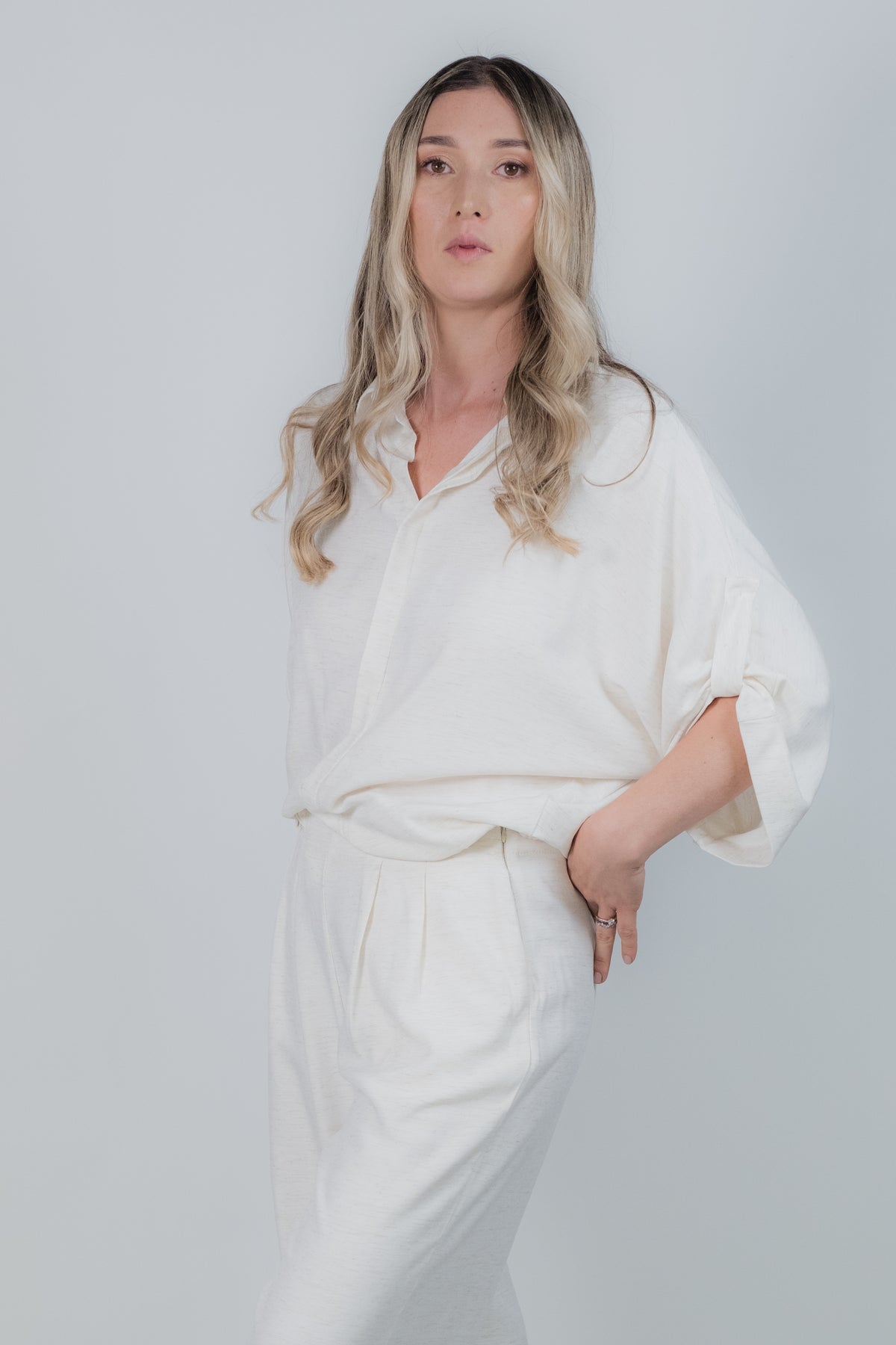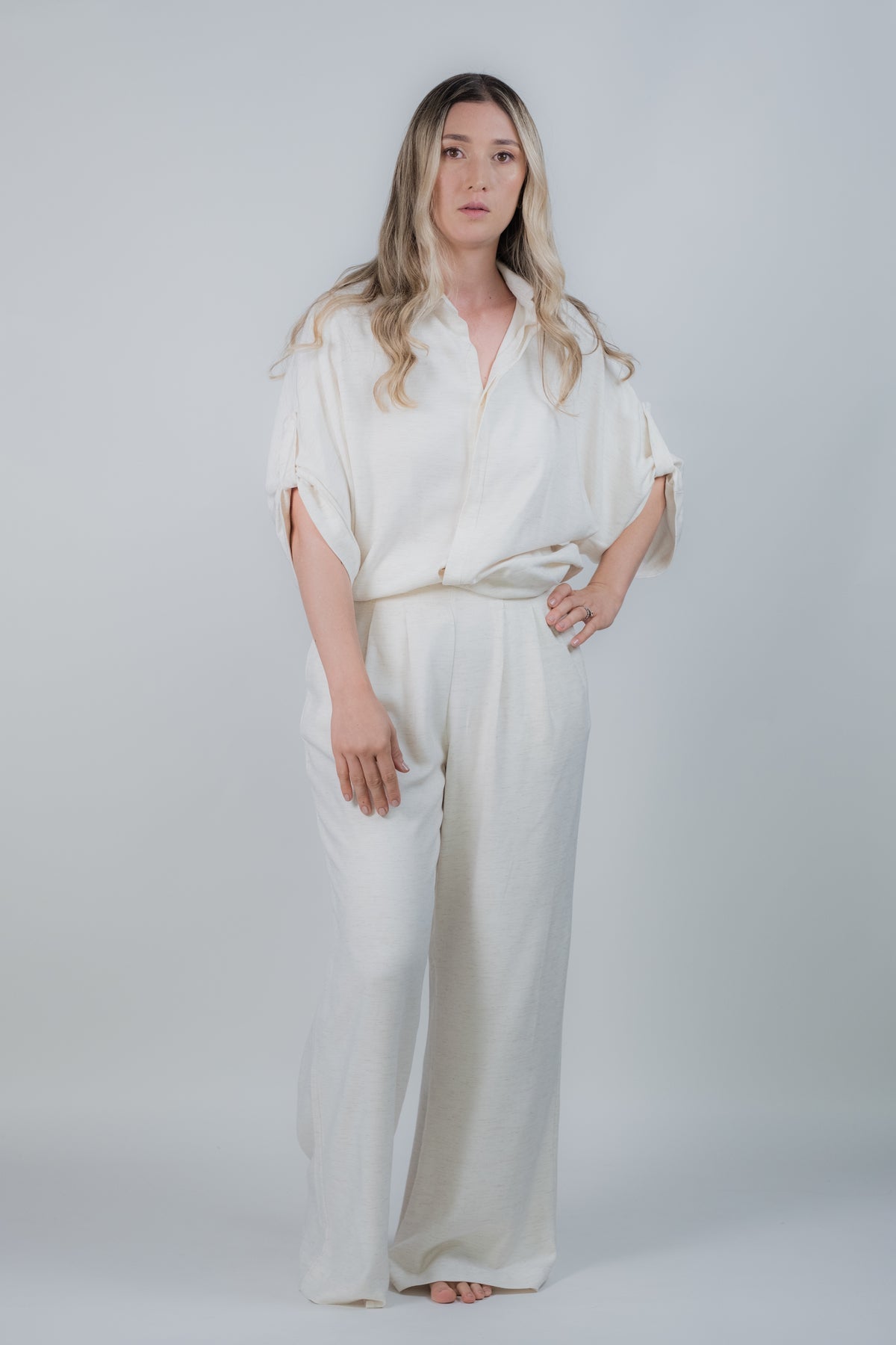 Pantalón ancho con prenses, trabilla lateral y bota ancha. Set con camisa manga mariposa, botonadura escondida y resortada en cintura.